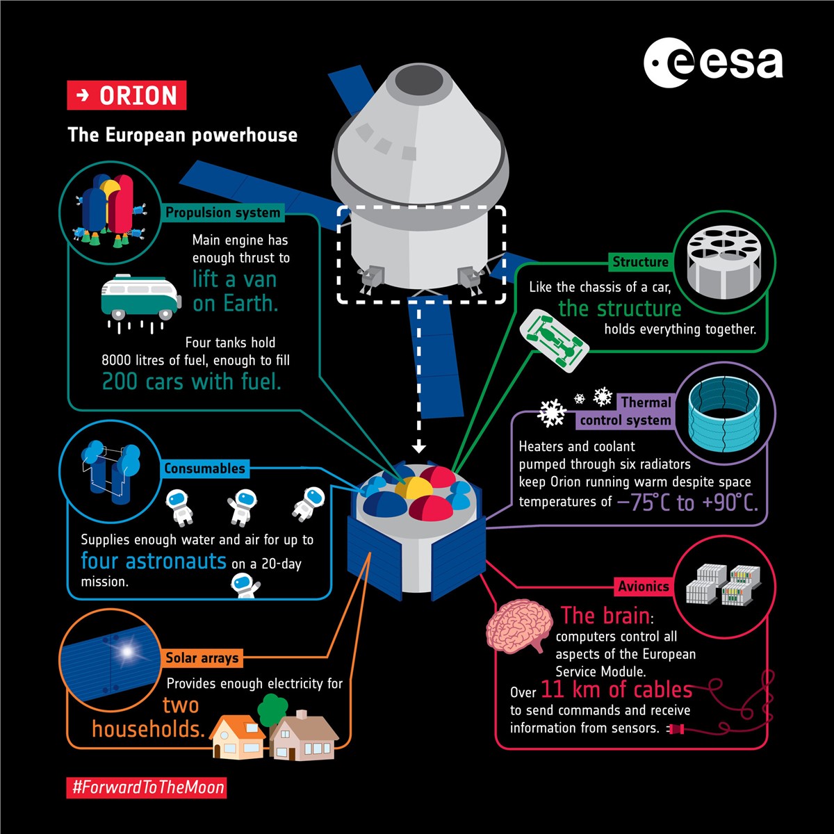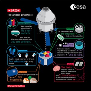 Download free sample pagesEach European Service Module (ESM) comprises more than 20 000 parts and components, from electrical equipment to engines, solar panels, fuel tanks and life-support elements for the astronauts, as well as approximately 12 kilometres of cables.