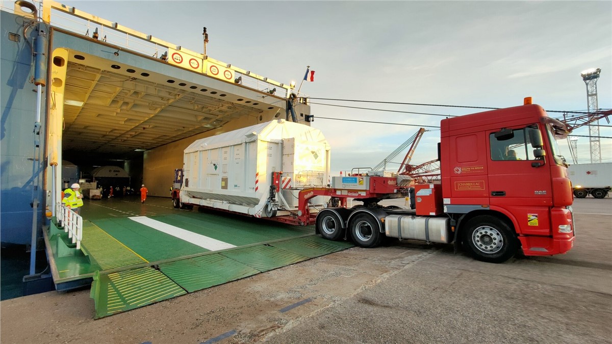 The first Meteosat Third Generation Imager, MTG-I1, satellite plus 10 large containers of support equipment were loaded onto the MN Toucan cargo ship on 29 September and readied for the 12-day voyage to French Guiana.