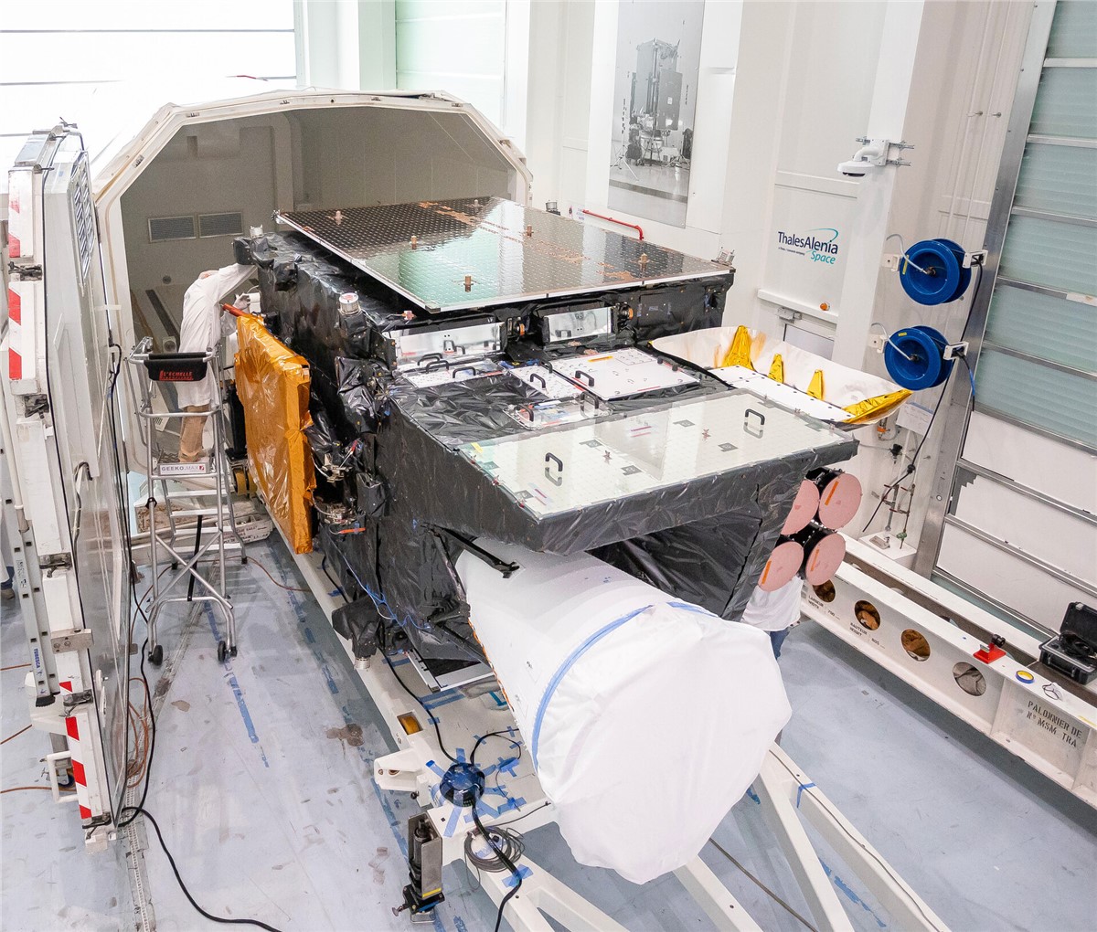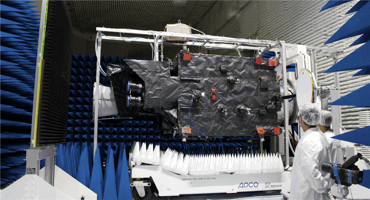 One of the last tests in Cannes involved the complex ‘compact antenna test range’ where a series of electromagnetic compatibility and radio frequency tests were carried out to ensure that no single part of the satellite disturbs or degrades any other part of satellite’s instruments.