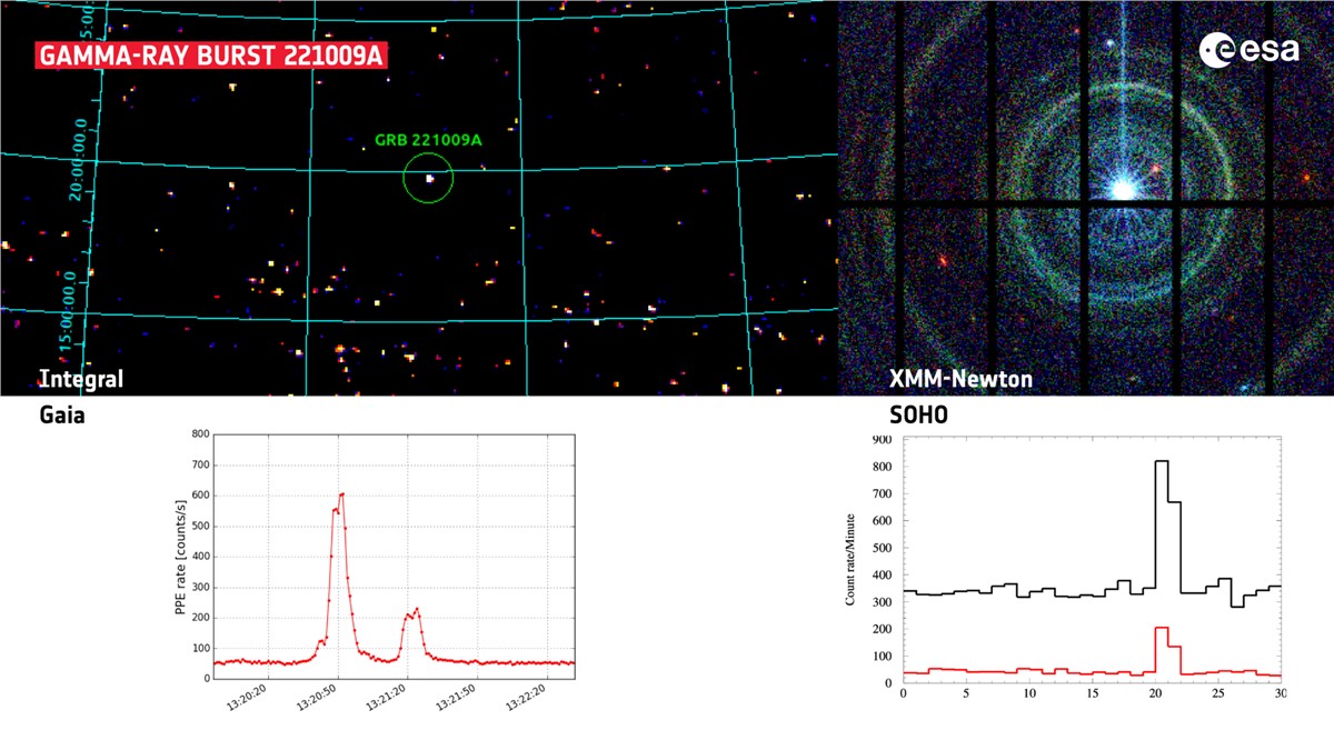 The energetic particle detector EPHIN on the SOHO spacecraft and the non-star object counter in the Sky Mapper instrument on the Gaia spacecraft picked up a signal at the same time around 13:20 UTC (15:20 CEST) on 9 October 2022. Gaia engineers were puzzled at first by this abnormal signal but soon discovered they had measured GRB 221009A. Graphs of the event by Gaia and SOHO are shown on the bottom of the image. The vertical shows the count of high-energetic particles/non-star objects over time. A clear peak shows the sudden detection of a high count.