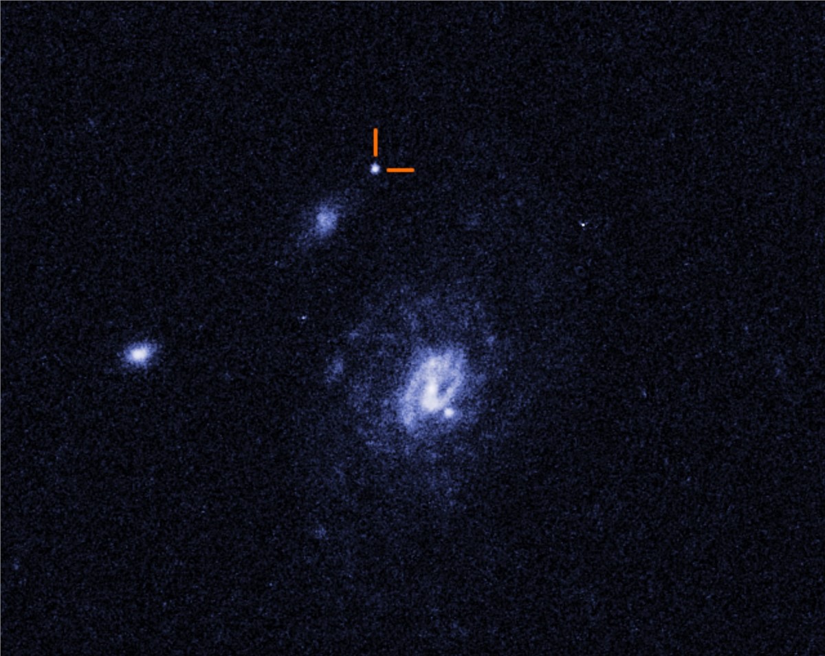 But unlike any other LFBOT seen before, Hubble found that the Finch is located between two neighboring galaxies – about 50,000 light-years from a nearby spiral galaxy and about 15,000 light-years from a smaller galaxy.