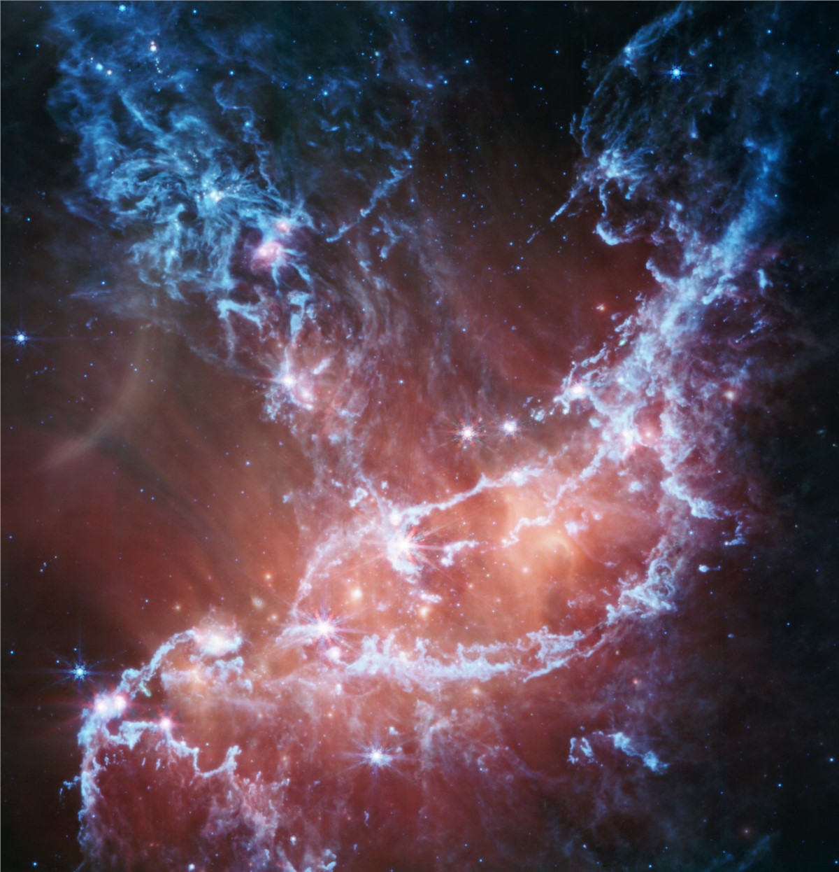 Download free sample pagesIn this representative-color image, blue tendrils trace emission from material that includes dusty silicates and sooty chemical molecules known as polycyclic aromatic hydrocarbons, or PAHs. More diffuse red emission shines from warm dust heated by the brightest and most massive stars in the heart of the region. An arc at the center left may be a reflection of light from the star near the arc’s center. (Similar, fainter arcs appear associated with stars at lower left and upper right.) Lastly, bright patches and filaments mark areas with abundant numbers of protostars. The research team looked for the reddest stars, and found 1,001 pinpoint sources of light, most of them young stars still embedded in their dusty cocoons.