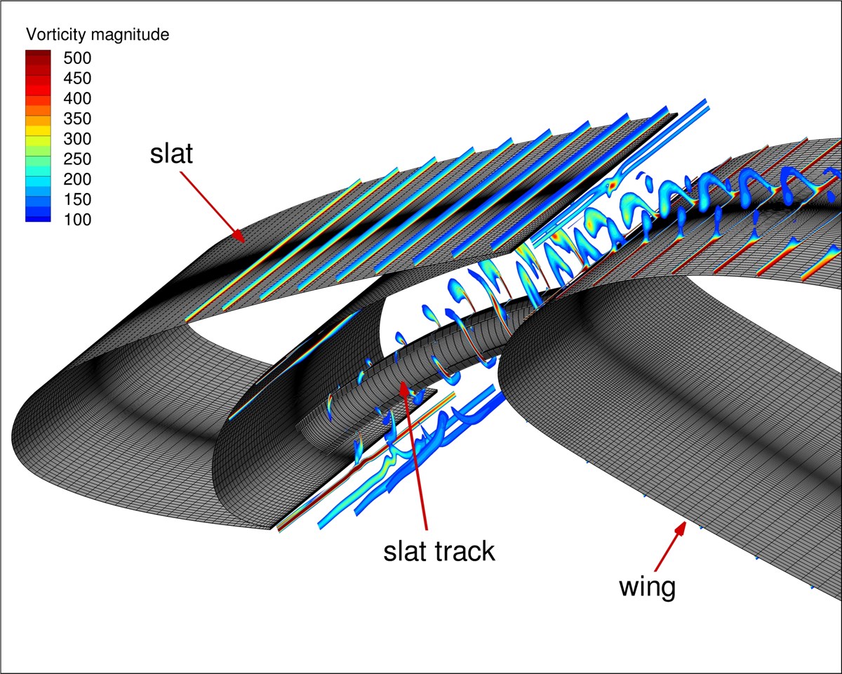 NLR focused on the noise generated by the deployed wing slats, which largely originates from the slat tracks that attach the slats to the wing. Based on numerical flow simulations, a low-noise slat track was designed using a tilted fairing to reduce flow separation. A range of slat track designs was then tested in NLR’s acoustic wind tunnel, showing a potential reduction of slat track noise by 5 to 10 dB. Finally, high-fidelity numerical simulations of slat-track noise generation were carried out and successfully validated with wind tunnel data.