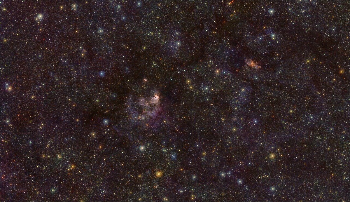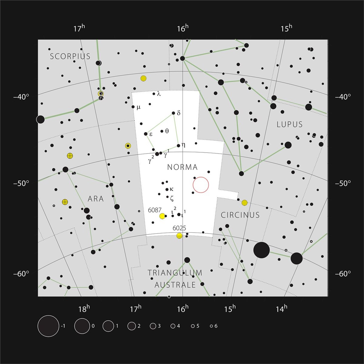 Located about 10 000 light-years away, this ‘cosmic bat’ is flying between the southern constellations of Circinus and Norma. Spanning an area of the sky equivalent to four full Moons, it looks as if it's trying to hunt the glowing spot above it for food.