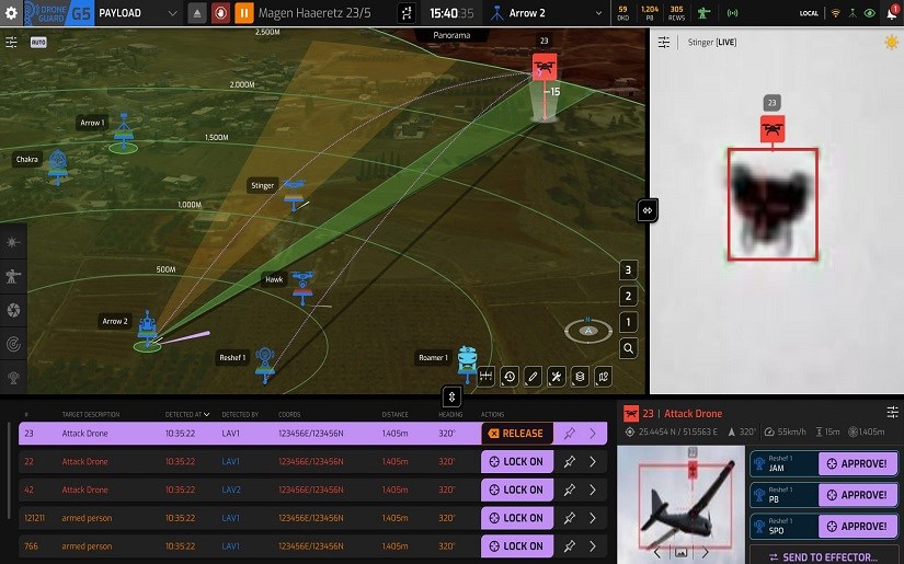At the core of the new generation C-UAS solution is an advanced autonomous C4I mission system that integrates unique algorithms, artificial intelligence and machine learning to deliver real-time threat detection, analysis and response management. The system intelligently recommends optimal interception methods to operators, enabling rapid response to threats and performing neutralization and interception actions autonomously, while keeping human involvement in the decision-making process. Enabling a seamless sensor-to-target loop targeting and attack using a variety of interceptor configurations, the system is deployed across vast areas and equipped with electro-optical, radar and other sensors. These sensors provide the operator with a detailed, real-time aerial picture, allowing for coordinated launches of multiple interceptors per target until a successful interception is confirmed. The system can operate numerous detection assets in different layers, while deploying jamming and electronic warfare measures for soft-kill interceptions, or using various interceptors to provide a comprehensive response for low-altitude threats.