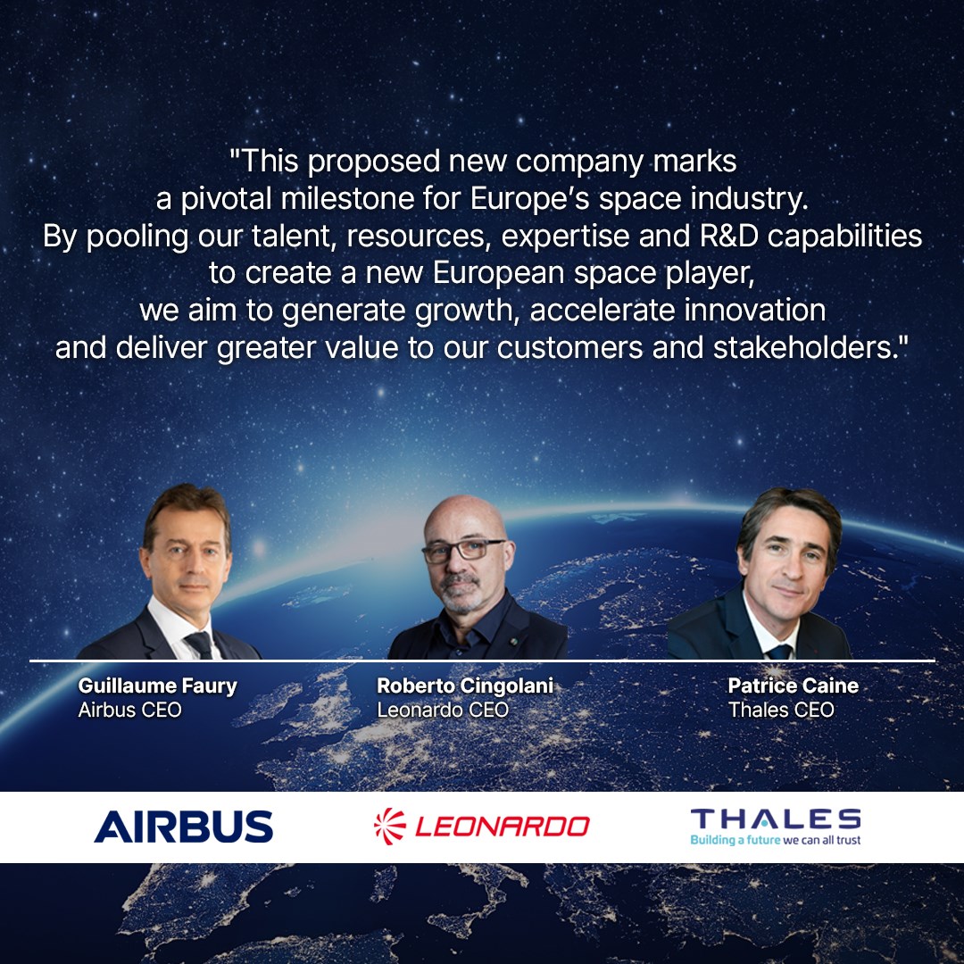“This proposed new company marks a pivotal milestone for Europe’s space industry. It embodies our shared vision to build a stronger and more competitive European presence in an increasingly dynamic global space market. By pooling our talent, resources, expertise and R&D capabilities, we aim to generate growth, accelerate innovation and deliver greater value to our customers and stakeholders. This partnership aligns with the ambitions of European governments to strengthen their industrial and technological assets, ensuring Europe’s autonomy across the strategic space domain and its many applications. It offers employees the opportunity to be at the heart of this ambitious initiative, while benefiting from enhanced career prospects and the collective strength of the three industry leaders.”